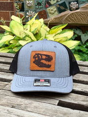 ADULT Richardson 112 Laser Engraved Leather Patch Hat- T-Rex Tyrannosaurus Rex Dinosaur Skull Hand Stitched Real Leather
