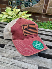 Legacy Hats OFA Laser Engraved Leather Patch Unstructured Hat- Show Steer American Flag Hand Stitched Real Leather-Cow Calf USA Patriotic