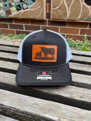 Richardson 112 Laser Engraved Leather Patch Hat- Custom Cow Calf Cattle Ranch Brand Silhouette Real Leather Hand Stitched