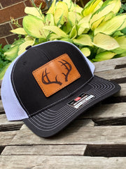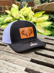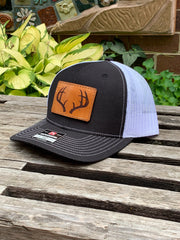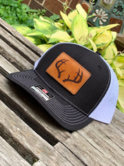 Richardson 112 Laser Engraved Leather Patch Hat- Deer Antlers Hunting Hunter Silhouette Hand stitched Authentic real leather Whitetail Buck