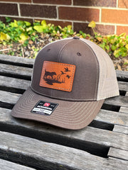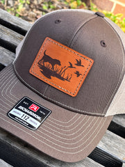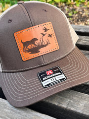 Richardson 112 Laser Engraved Leather Patch Hat-Hunting Dog with Ducks Hunting Silhouette Hand stitched Authentic real leather Duck hunter
