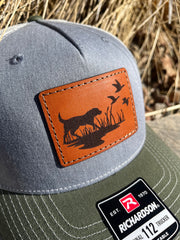 Richardson 112FP Laser Engraved Leather Patch Hat-Hunting Dog with Ducks Patch Hand Stitched Real Leather Custom Shape Five Panel