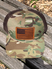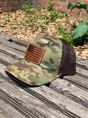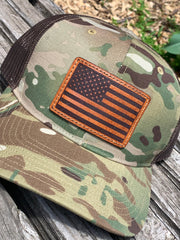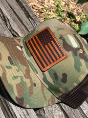 Richardson 862 Laser Engraved Leather Patch Hat- Multicam Trucker Tactical Camo American Flag Patriotic Military Hand Stitched Real Leather