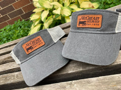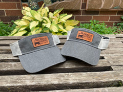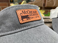 These leather patch Sportsman Visor hats are a great way to flaunt your style and look sleek at the same time. Patches made from 100% leather and engraved with a crisp design and hand stitched on our most popular style of hat. Your friends are going to be jealous!