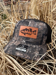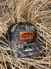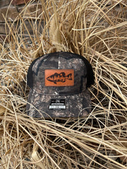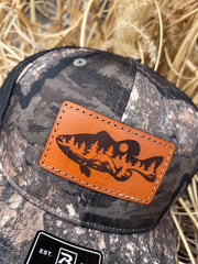 Leather Patch Camo Richardson 112P Snapback Laser Engraved Leather Patch Hat-Bass Fishing Scene Fisherman Fishing Hand Stitched Real Leather