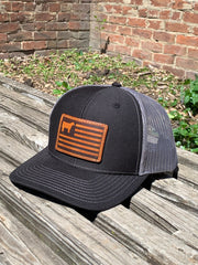 Richardson 112 Black with Charcoal Mesh Laser Engraved Leather Patch Hat- Show Steer American Flag Cow Calf Hand Stitched Real Leather